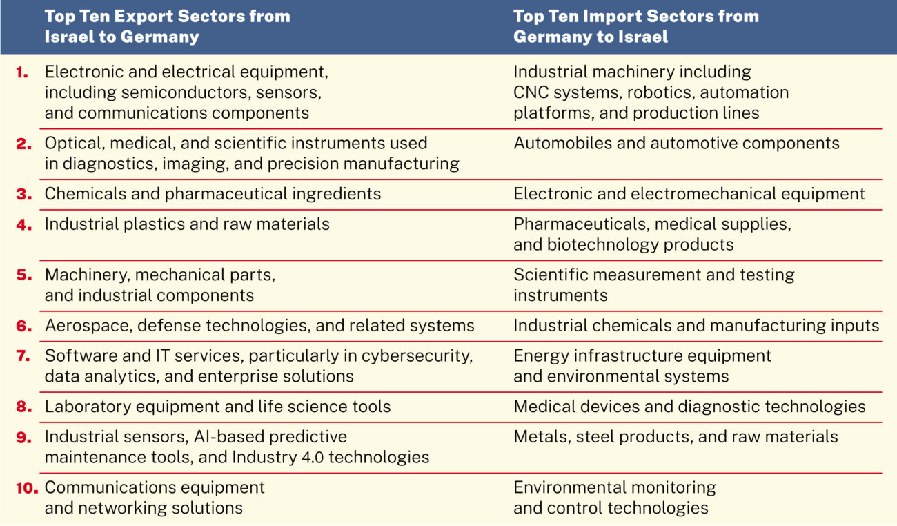 The majority of trade between the countries consists of industrial products and high-value technologies. Israeli exports focus on medical devices, optics, electronics, chemical materials, life science equipment, cybersecurity and specialized machinery. German exports to Israel include industrial machinery, vehicles, pharmaceutical products, electronics and advanced medical technologies.
